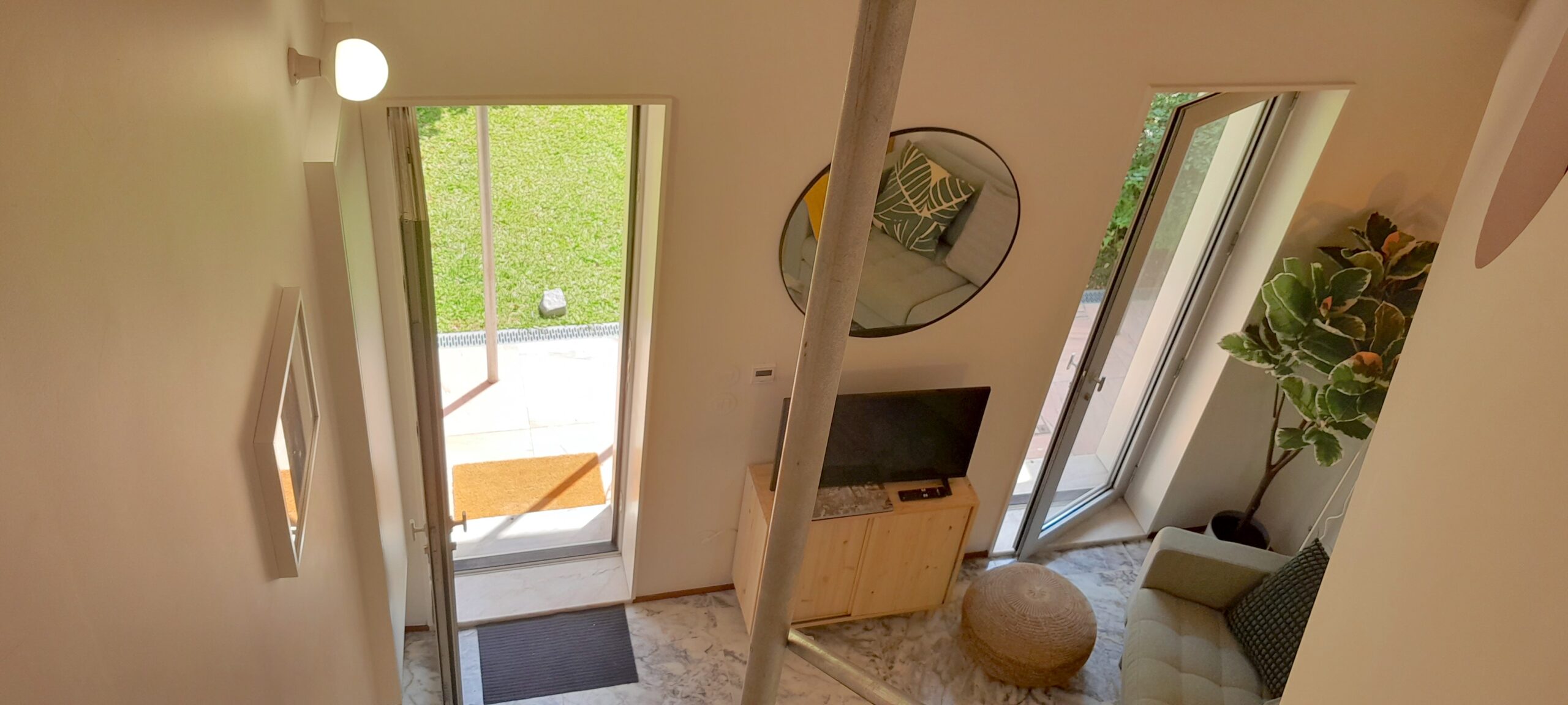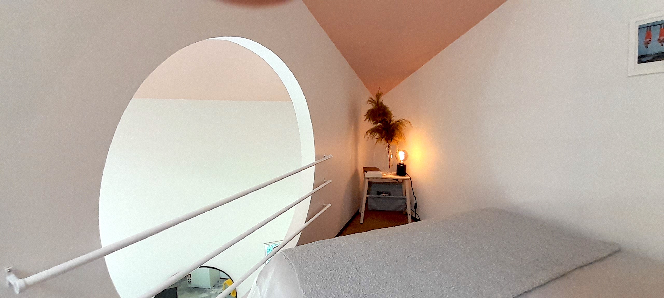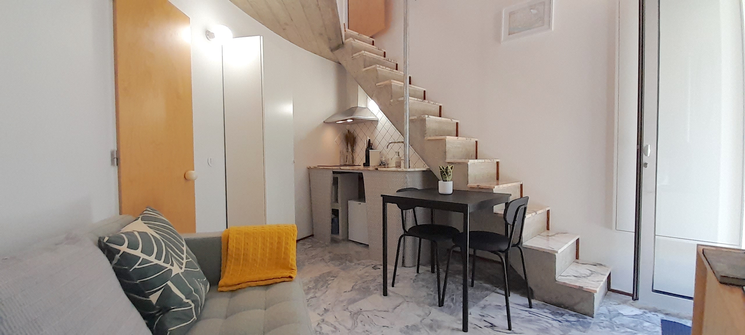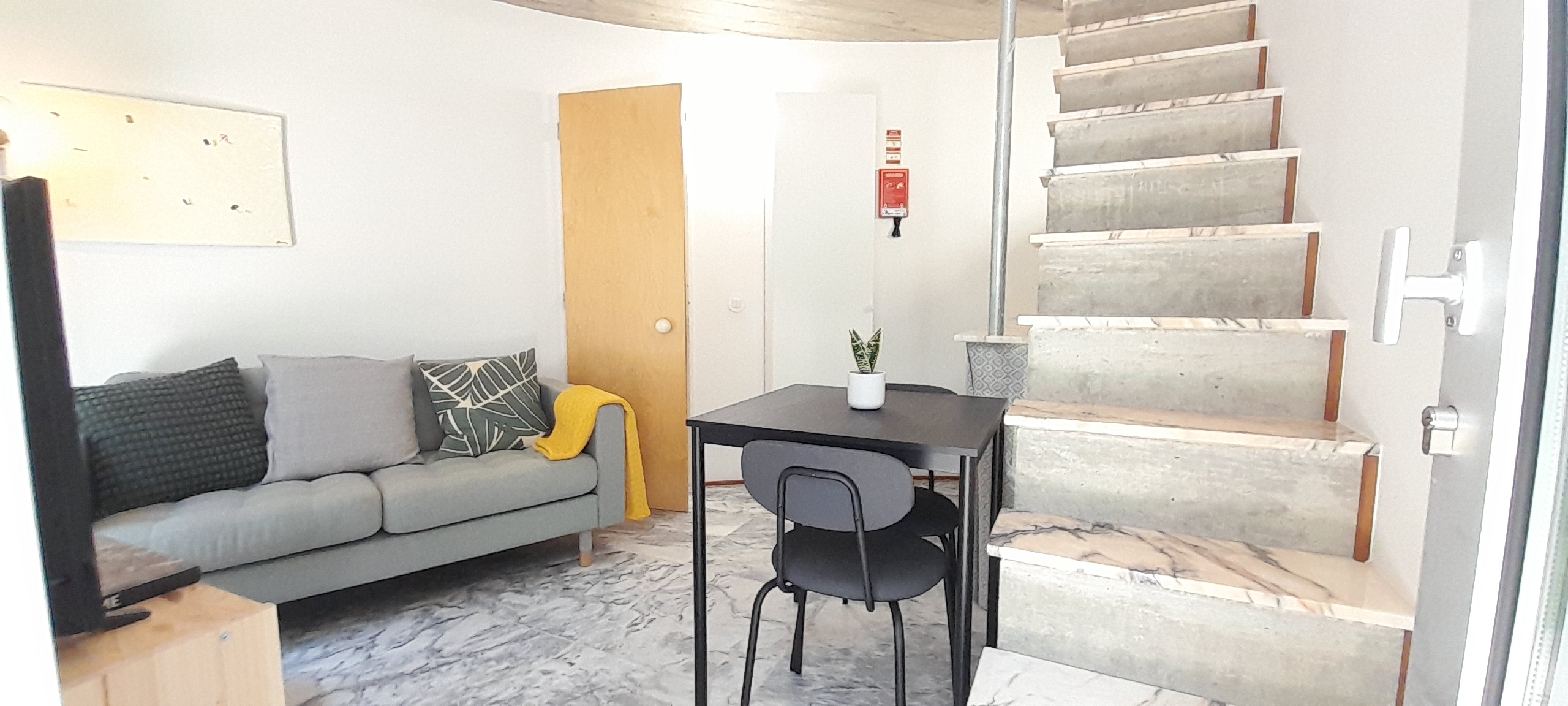 It’s a small house (30 m2) with two floors, high ceilings and an open-plan feel. It’s a very cool space!