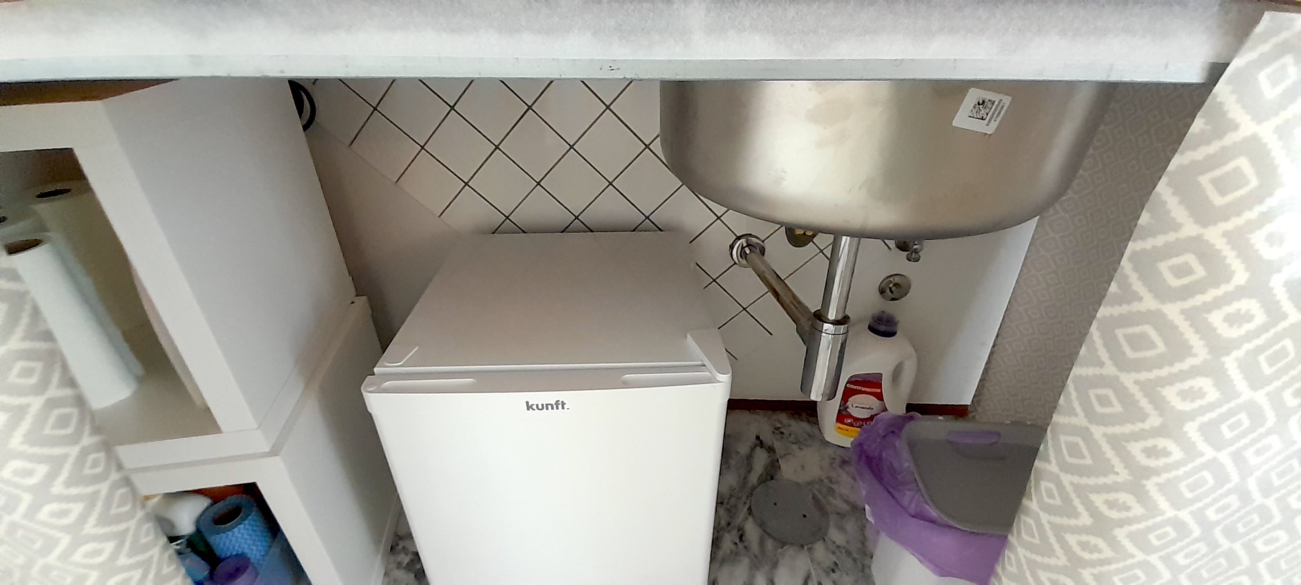 The main floor contains a spacious bathroom with a walk-in shower, a kitchenette with a small fridge and cooker (see below for more details) and a living room with a sofa, TV and dining area.