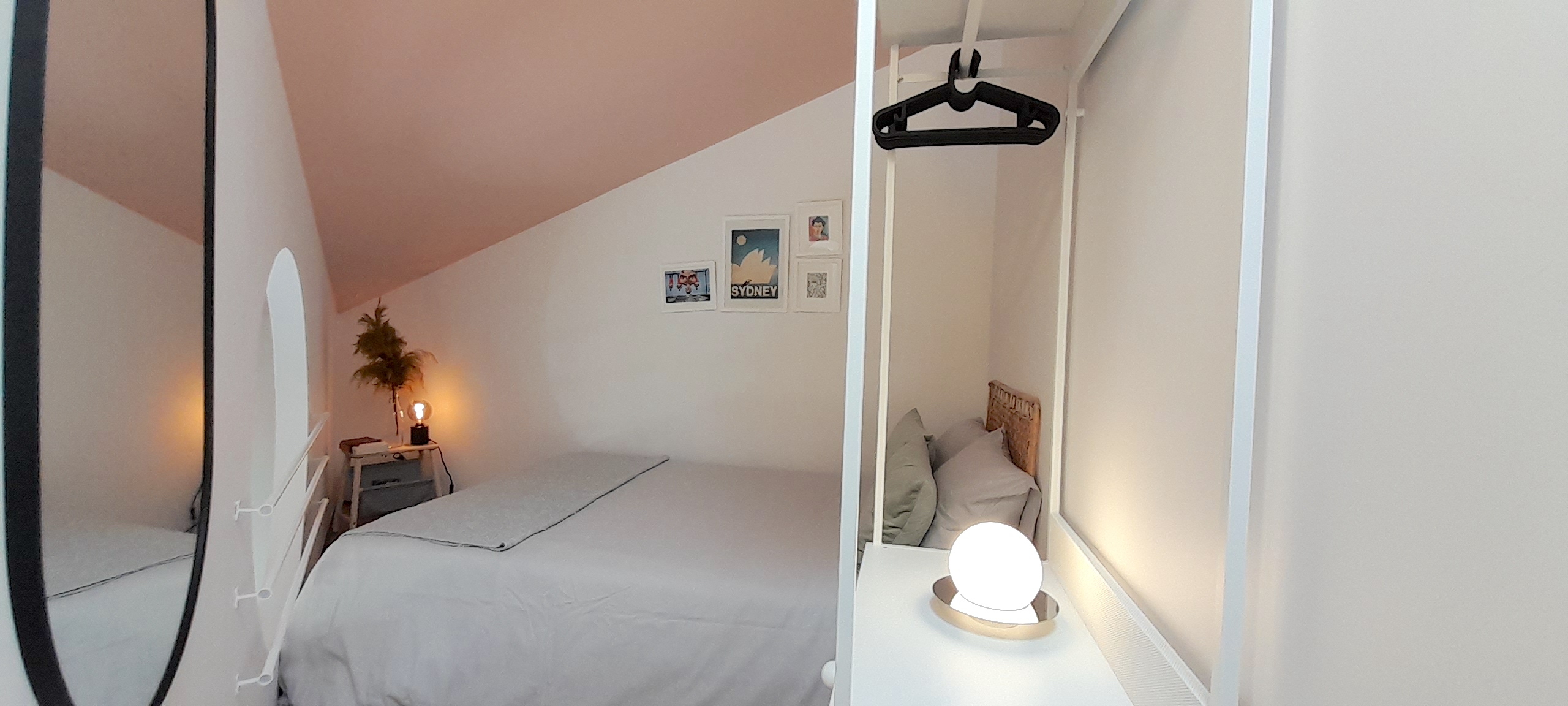The upstairs bedroom has a double bed, a wardrobe and a skylight to let in the sunlight.