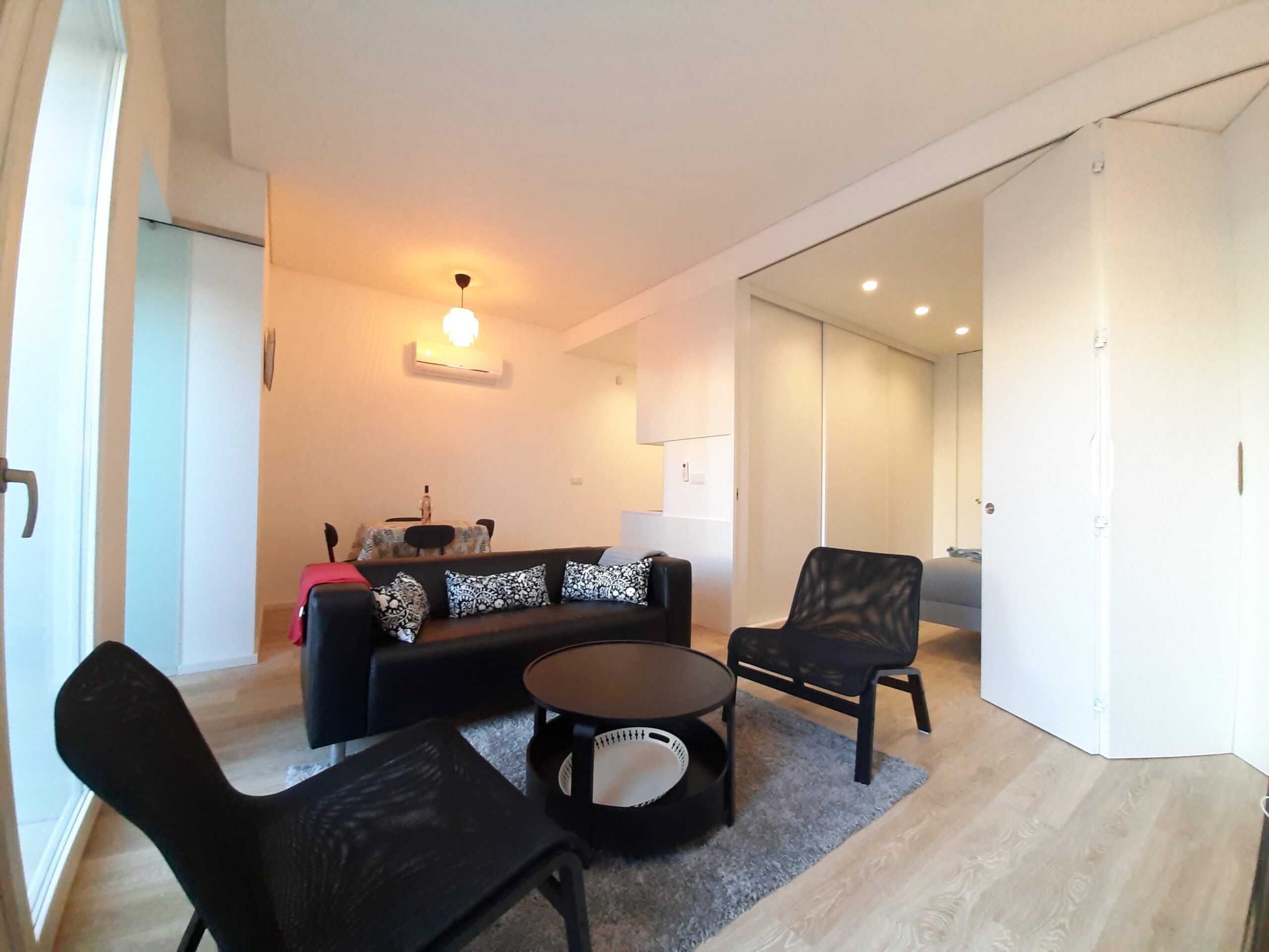 Entering the flat, on the left is the kitchen area with plenty of storage. At the back is the dining and living room, which gives access to the interior suite on the left and to the other suite on the right, which overlooks the patio and also gives access to the patio and garden.