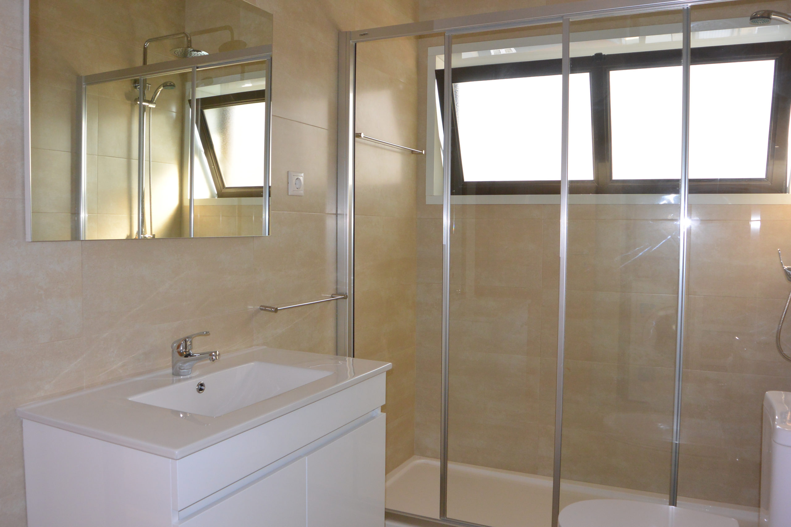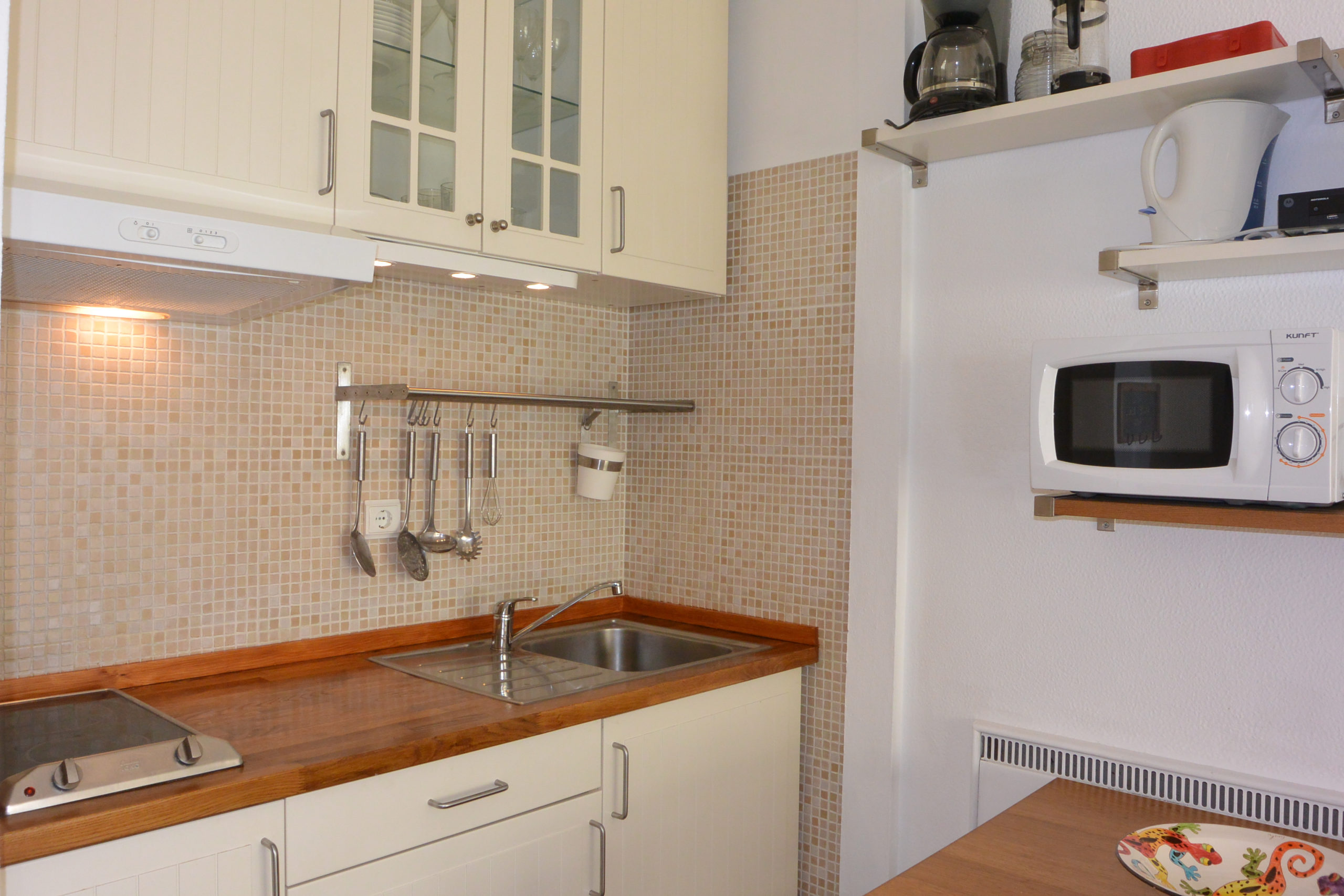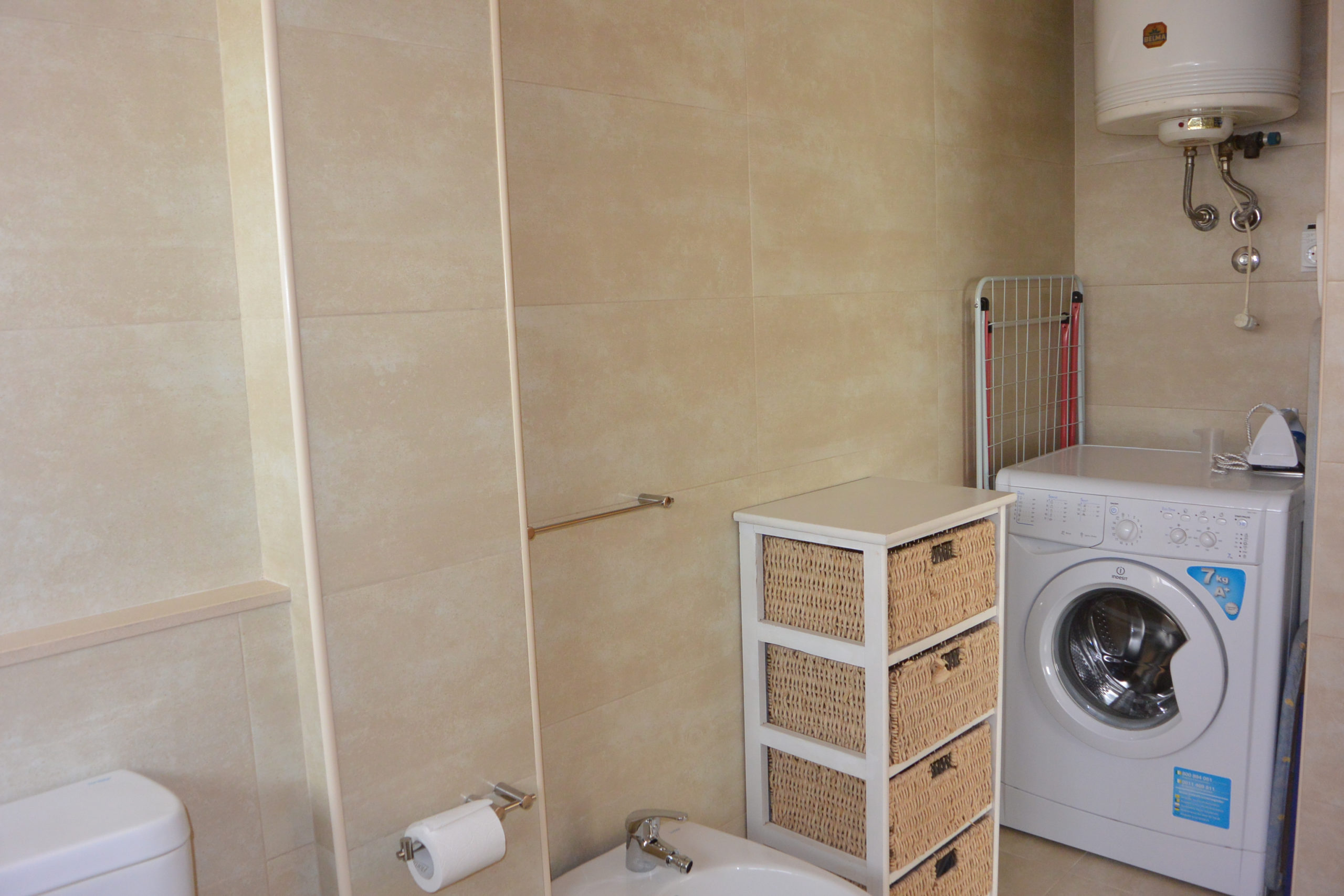 The bedroom has a king size bed, a wardrobe and chest of drawers. It has two windows and a balcony. From here you reach the spacious bathroom with walk-in shower which also has a window. Here is located the washing machine.